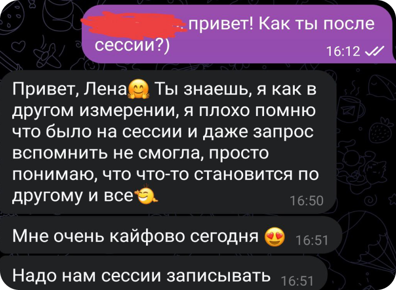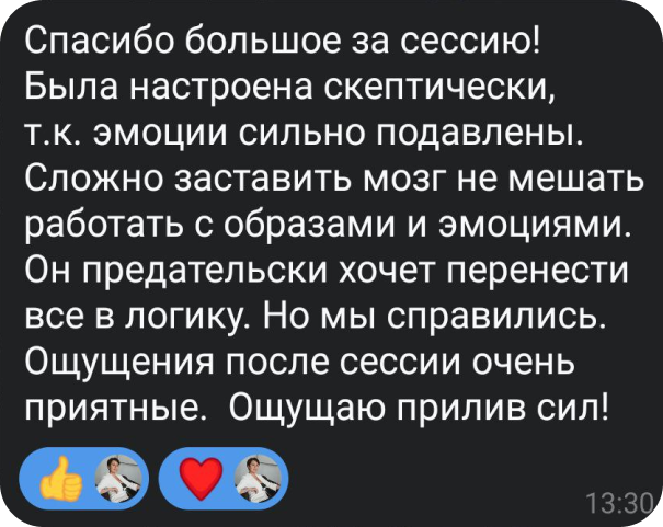 Спасибо большое за сессию! Была настроена скептически, т.к. эмоции сильно подавлены. Сложно заставить мозг не мешать работать с образами и эмоциями. Он предательски хочет перенести все в логику. Но мы справились. Ощущения после сессии очень приятные. Ощущаю прилив сил!