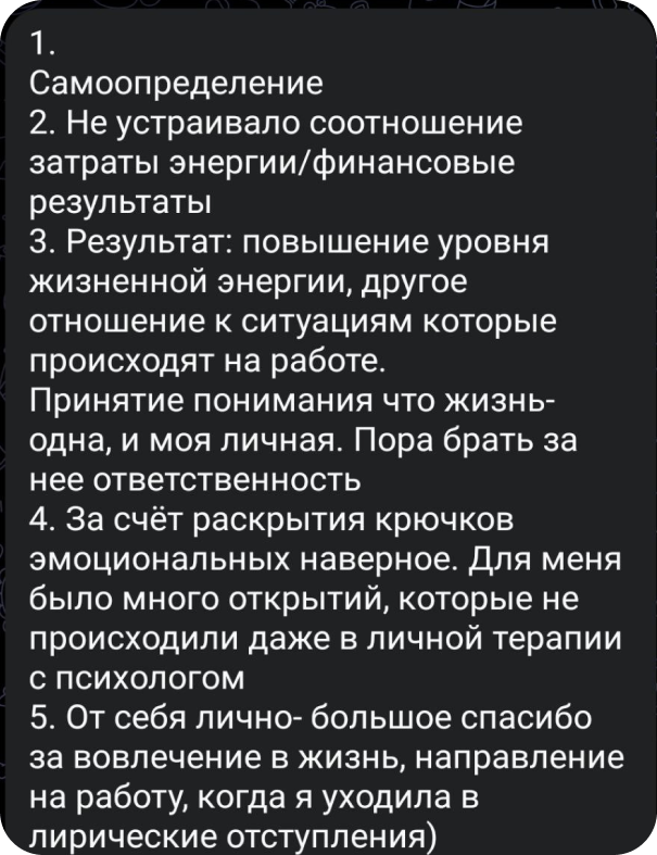 Повышение уровня жизненной энергии, другое отношение к ситуациям которые происходят на работе. Принятие понимания что жизнь одна, и моя личная. Пора брать за неё ответственность.