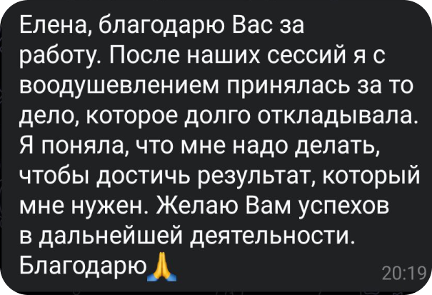 Елена, благодарю Вас за работу. После наших сессий я с воодушевлением принялась за то дело, которое долго откладывала. Я поняла, что мне надо делать, чтобы достичь результат, который мне нужен. Желаю вам успехов в дальнейшей деятельности. Благодарю.