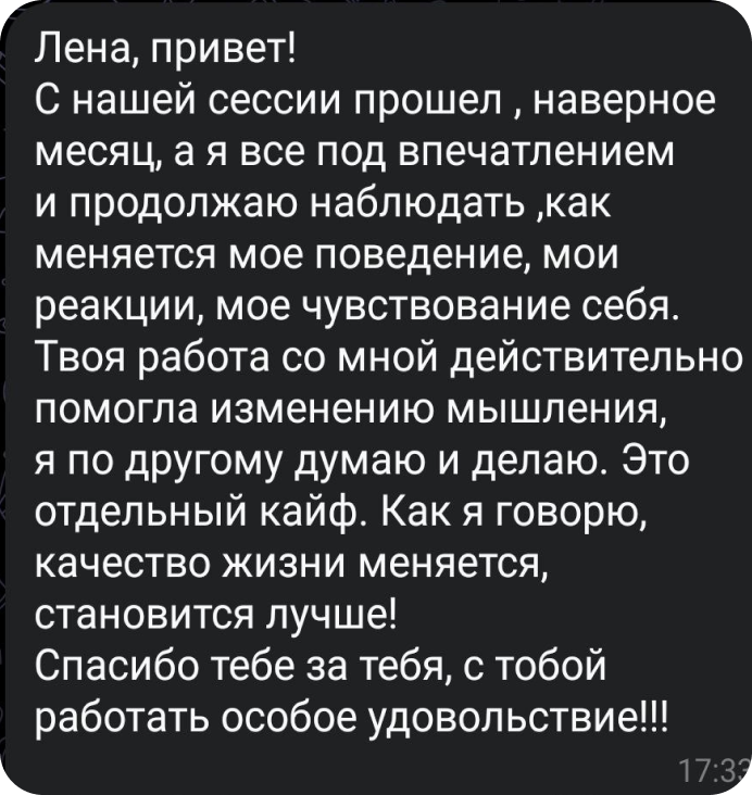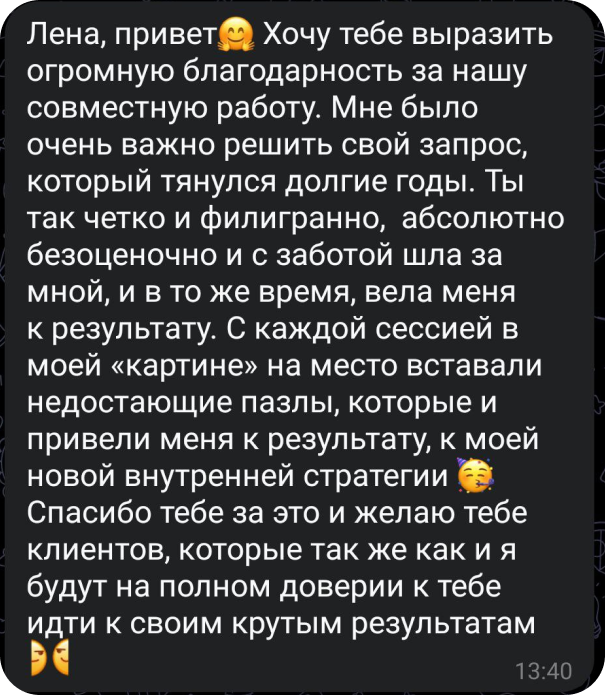 Лена, привет. Хочу тебе выразить огромную благодарность за нашу совместную работу. Мне было очень важно решить свой запрос, который тянулся долгие годы. Ты так четко и филигранно, абсолютно безоценочно и с заботой шла за мной, и в то же время, вела меня к результату. С каждой сессией в моей “картине” на место вставали недостающие пазлы, которые и повели меня к результату, к моей новой внутренней стратегии. Спасибо тебе за это и желаю тебе клиентов, которые так же как и я будут на полном доверии к тебе идти к своим крутым результатам.